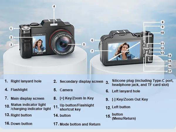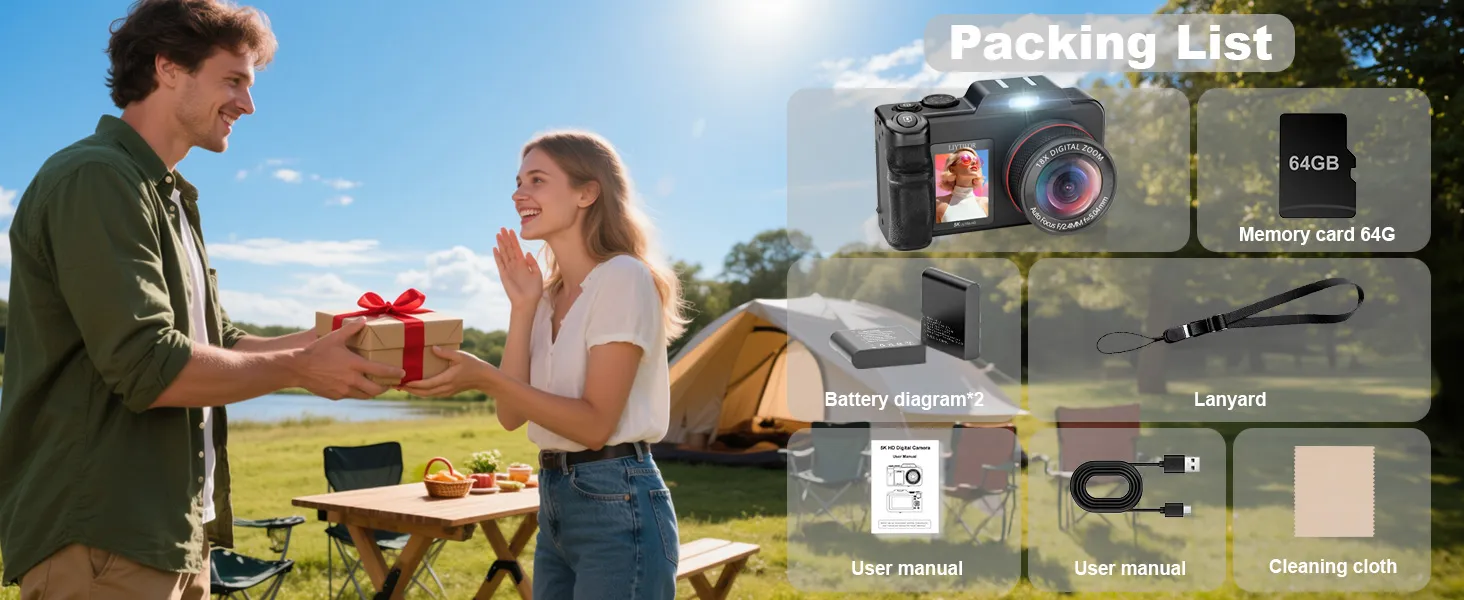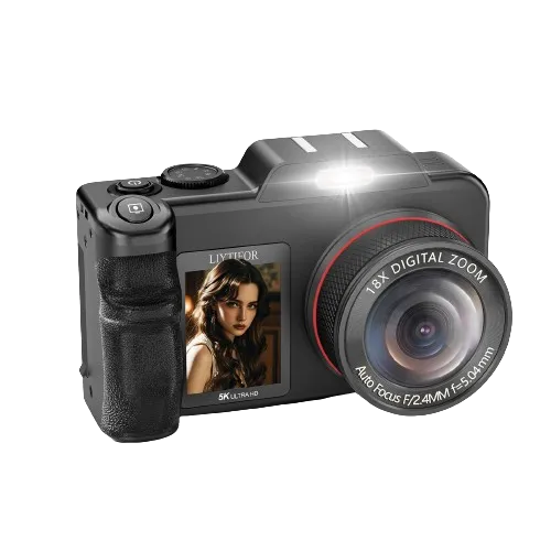 The 5K Duel Screen Camera is quite unique, boasting two LCD screens and offering 18X zoom and 5K video recording. It’s essentially a high-tech digital camera loaded with numerous settings and adjustments to enhance your photography and video capturing experience. The camera feels sturdy after unpacking, with buttons that respond quickly and a grip that makes it easy to hold, similar to a standard DSLR. I’m not sure if the top is for flash attachments, as it didn’t specify, but it seems more like a decorative element. The camera is surprisingly lightweight, which is a pleasant surprise compared to other lenses and heavier DSLR cameras.